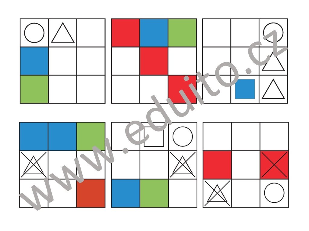 Balení obsahuje: barevně odlišené karty k tvoření úloh, karty s obrázky, které se vkládají do čtvercové sítě (pro každou skupinu 9 obrázků), zadání, řešení