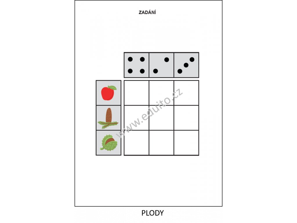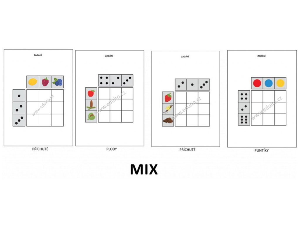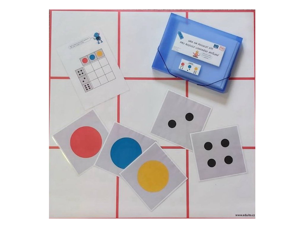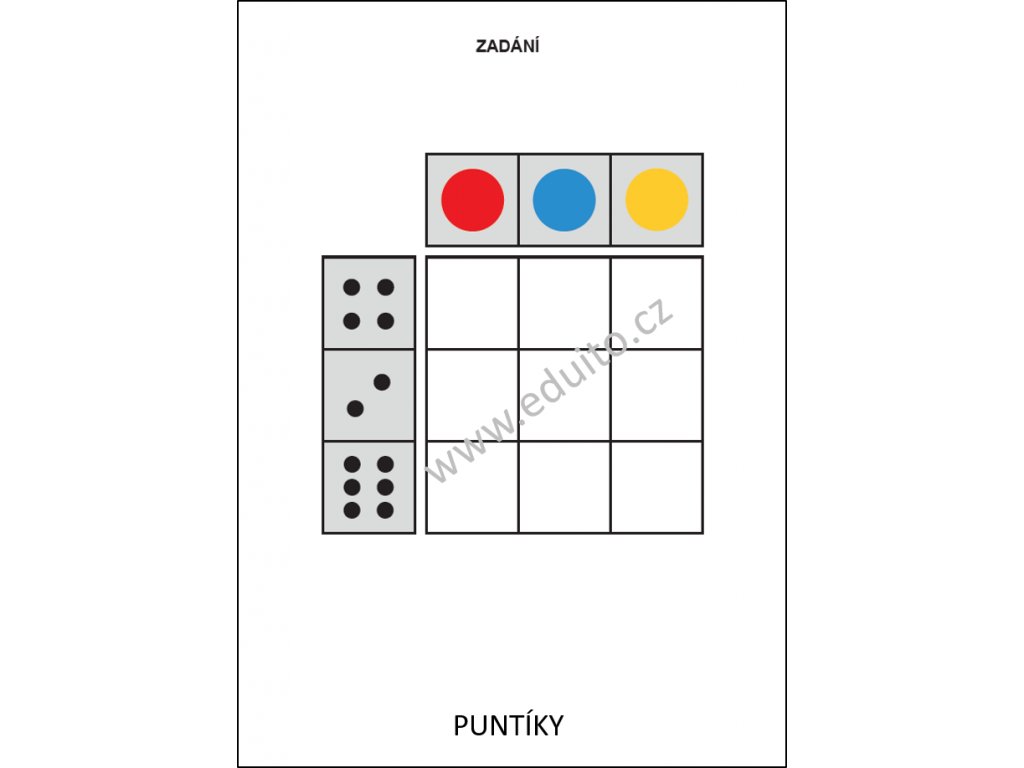 Balení obsahuje: barevné karty s obrázky pro tvoření zadání hry, karty s obrázky, které se vkládají do čtvercové sítě (pro každou skupinu 9 obrázků), zadání, řešení