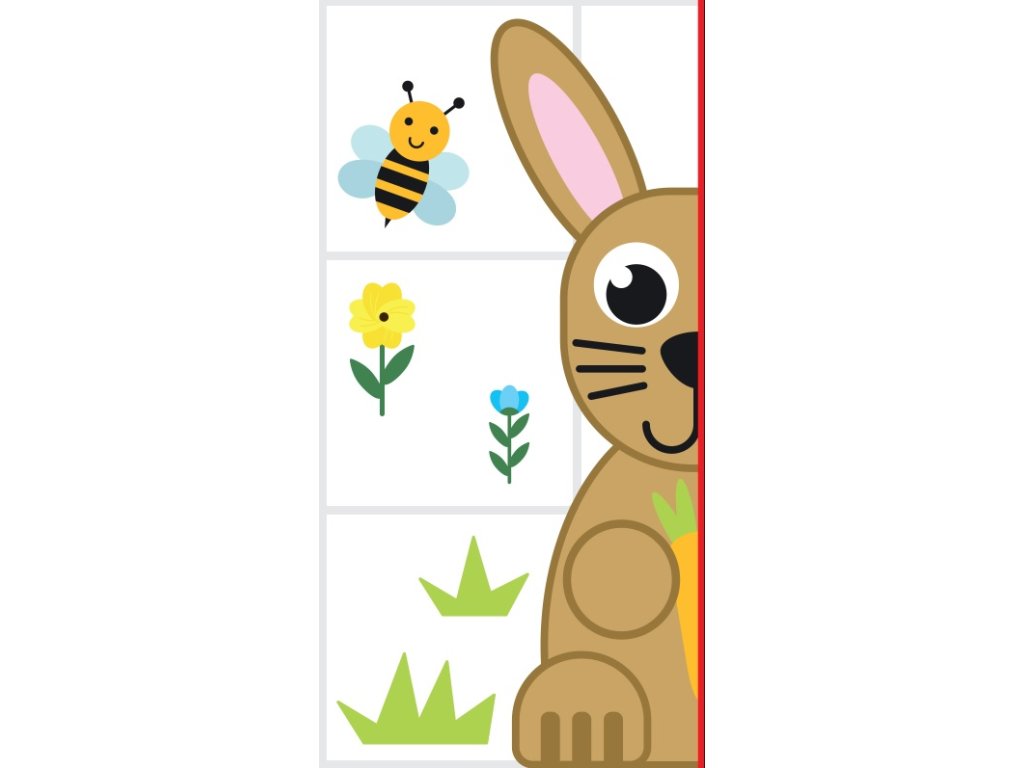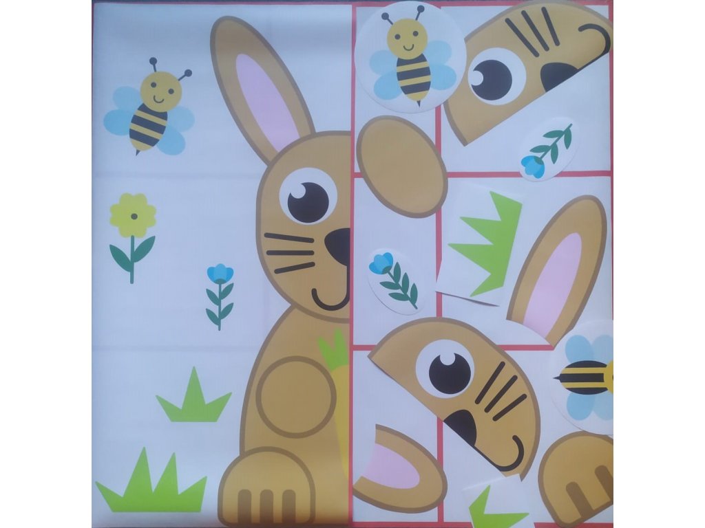 Procvičování osové souměrnosti - děti mají za úkol vybrat správné obrázky, které k zajíci patří, a poskládat je zrcadlově k předloze zajíce.